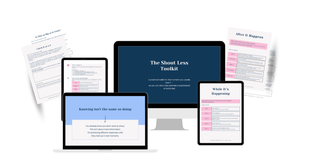 For the mum who knows exactly how one hard moment can ruin the rest of the day. The Shout Less Toolkit gives you practical tools to stop the shouting before it happens, handle it when you’re already in it, and repair it properly when you don’t.